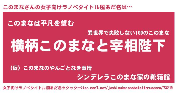 | 男性向けラノベタイトル風あだ名 | 『このまなに滅ぼされるだけの簡単なお仕事です』 |