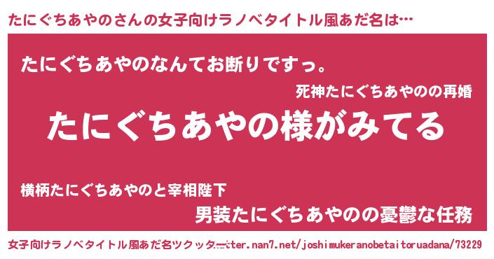 | 男性向けラノベタイトル風あだ名 | 『たにぐちあやのの嫁は女の子じゃないと思った?』 |