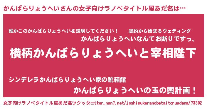 | 男性向けラノベタイトル風あだ名 | 『かんばらりょうへいに滅ぼされるだけの簡単なお仕事です』 |
