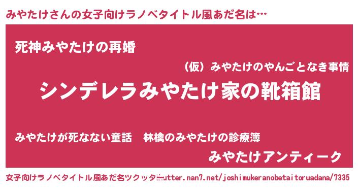| 男性向けラノベタイトル風あだ名 | 『緋弾のミヤタケ』『みやたけの憂鬱』 |