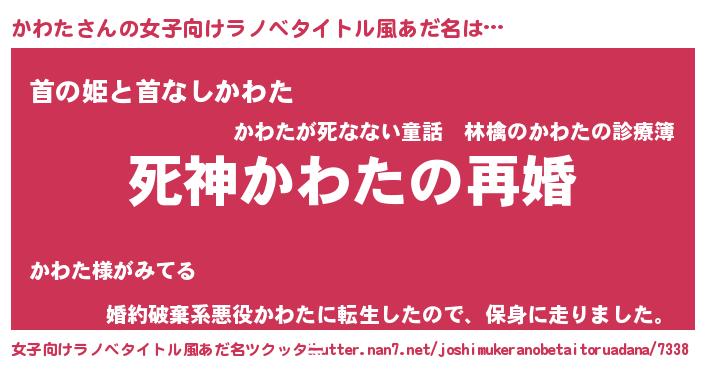 | 男性向けラノベタイトル風あだ名 | 『ノーゲーム・ノーカワタ』 |