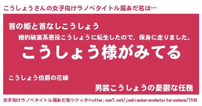 | 男性向けラノベタイトル風あだ名 | 『こうしょうの嫁は女の子じゃないと思った?』 |
