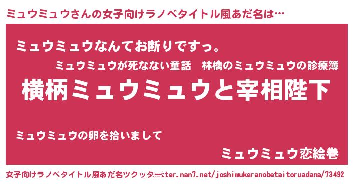 | 男性向けラノベタイトル風あだ名 | 『ミュウミュウに滅ぼされるだけの簡単なお仕事です』 |