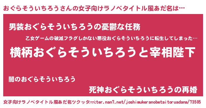 | 男性向けラノベタイトル風あだ名 | 『おぐらそういちろうに滅ぼされるだけの簡単なお仕事です』 |
