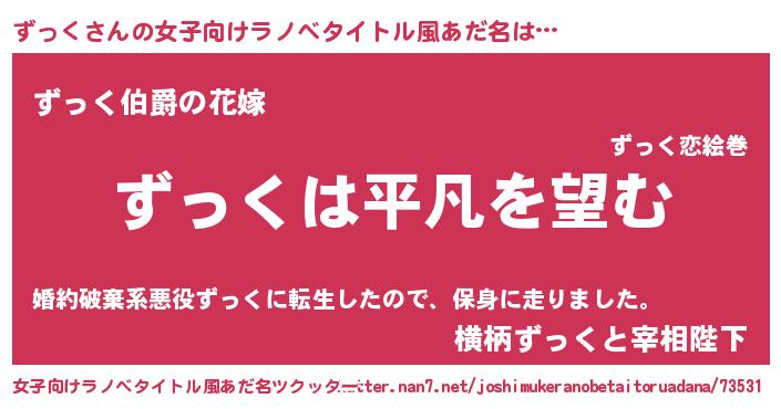 | 男性向けラノベタイトル風あだ名 | 『ダンジョンにずっくを求めるのは間違っているだろうか』 |