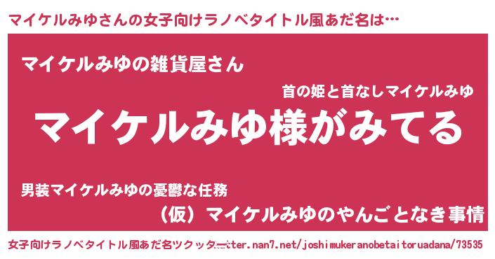 | 男性向けラノベタイトル風あだ名 | 『マイケルみゆの嫁は女の子じゃないと思った?』 |
