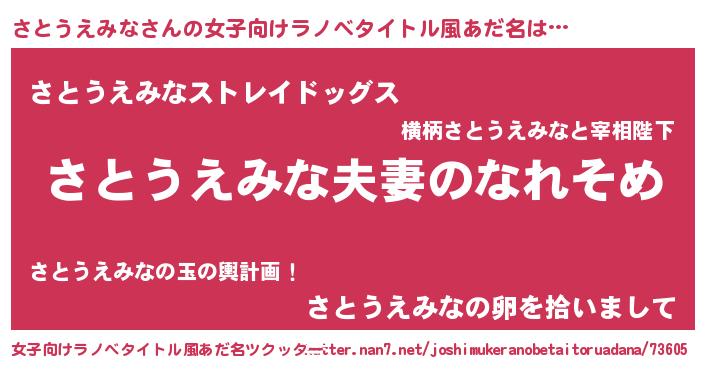 | 男性向けラノベタイトル風あだ名 | 『おまえをオタクにしてやるから、俺をさとうえみなにしてくれ! 』 |