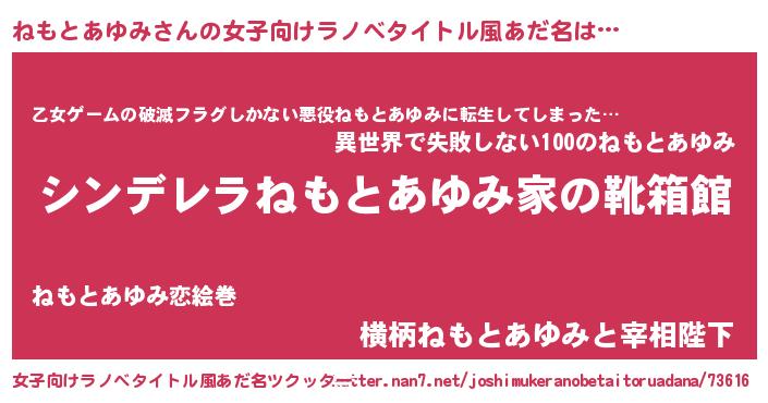 | 胡散臭い通販商品みたいなあだ名 | 『世界中を虜にした世界で10本だけ現存している希少なブランデー…その名も「ねもとあゆみ」』 |