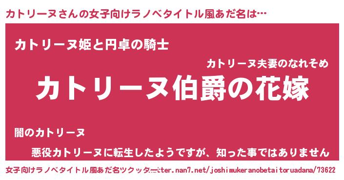 | 男性向けラノベタイトル風あだ名 | 『うちの娘の為ならば、俺はもしかしたらカトリーヌも倒せるかもしれない。』 |
