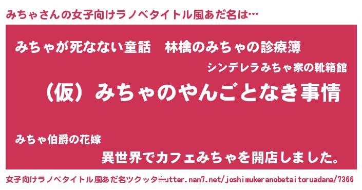 | 男性向けラノベタイトル風あだ名 | 『みちゃの憂鬱』『魔弾の王とみちゃ』 |