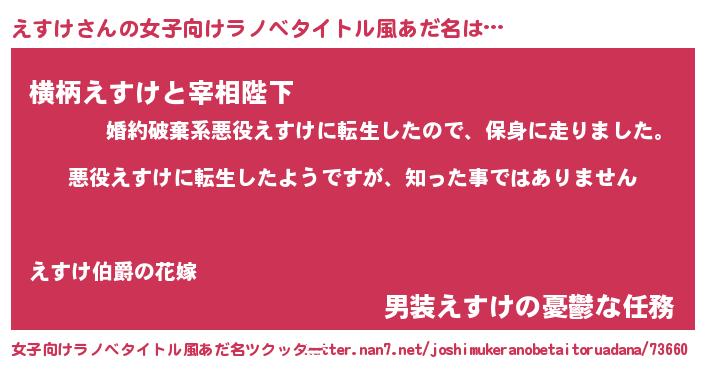| 男性向けラノベタイトル風あだ名 | 『この素晴らしい世界にえすけを!』 |