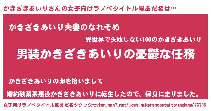 | 男性向けラノベタイトル風あだ名 | 『うちのかきざきあいりが世界を掌握している!』 |