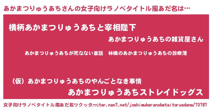 | 男性向けラノベタイトル風あだ名 | 『魔弾の王とあかまつりゅうあち』 |