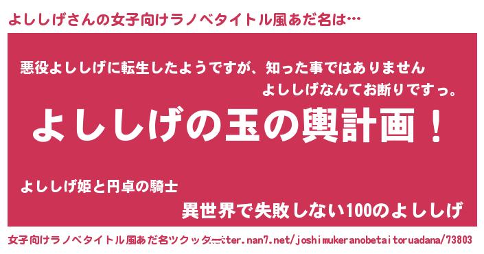 よししげさんの女子向けラノベタイトル風あだ名は… 『よししげの玉の輿計画!』『悪役よししげに転生したようですが、知った事ではありません』『異世界で失敗しない100のよししげ』 ツクッター #女子向けラノベタイトル風あだ名ツクッター http://tkutter.nan7.net/joshimukeranobetaitoruadana/73803/
