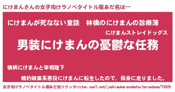 | 男性向けラノベタイトル風あだ名 | 『うちのにけまんが世界を掌握している!』 |