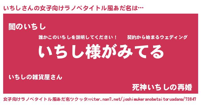 | 男性向けラノベタイトル風あだ名 | 『いちしの嫁は女の子じゃないと思った?』 |