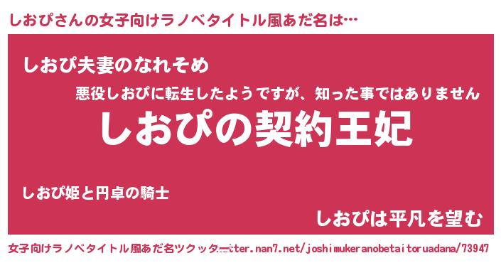| 男性向けラノベタイトル風あだ名 | 『誰もが恐れるあのしおぴが、ぼくの専属メイドになるようです。』 |