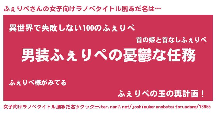 | 男性向けラノベタイトル風あだ名 | 『うちのふぇりぺが世界を掌握している!』 |