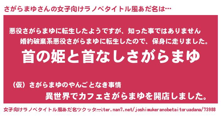 | ヘコむあだ名 | 『さがらまゆ(爆)』『さがにゅー』 |