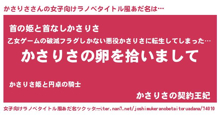 | 男性向けラノベタイトル風あだ名 | 『かさりさの嫁は女の子じゃないと思った?』 |