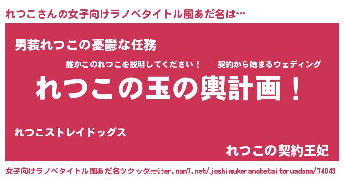 | 男性向けラノベタイトル風あだ名 | 『れつこ~年齢イコール彼女いない歴の魔法使い~』 |