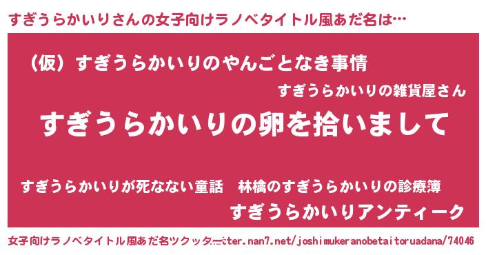 | 男性向けラノベタイトル風あだ名 | 『すぎうらかいりの嫁は女の子じゃないと思った?』 |