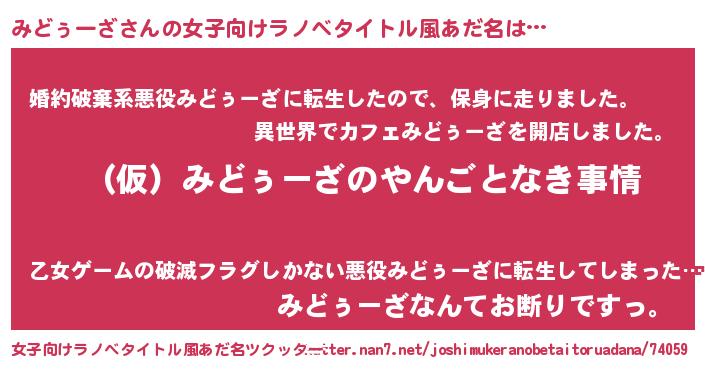 | 男性向けラノベタイトル風あだ名 | 『みどぅーざの憂鬱』 |