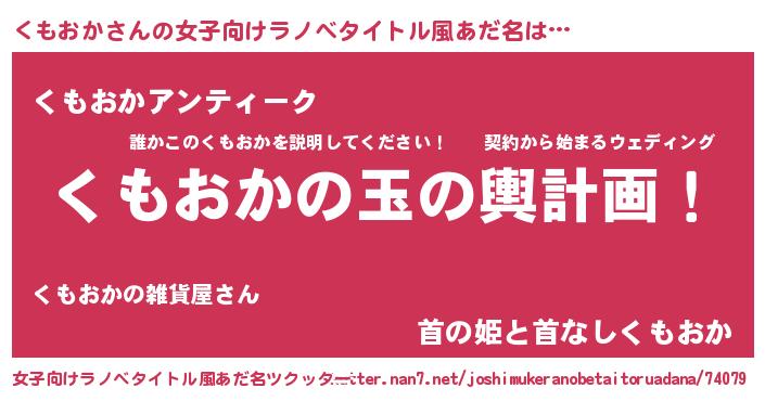 男性向けラノベタイトル風あだ名 | 『くもおか~年齢イコール彼女いない歴の魔法使い~』 |
