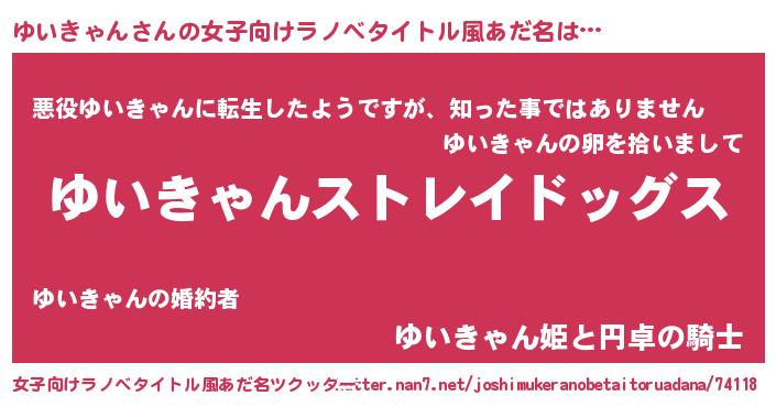 ゆいきゃんさんの女子向けラノベタイトル風あだ名は… 『ゆいきゃんストレイドッグス』『悪役ゆいきゃんに転生したようですが、知った事ではありません』『ゆいきゃん姫と円卓の騎士』 ツクッター #女子向けラノベタイトル風あだ名ツクッター http://tkutter.nan7.net/joshimukeranobetaitoruadana/74118/