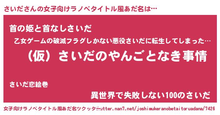 | 男性向けラノベタイトル風あだ名 | 『さいだの憂鬱』『はたらくさいださま!』 |
