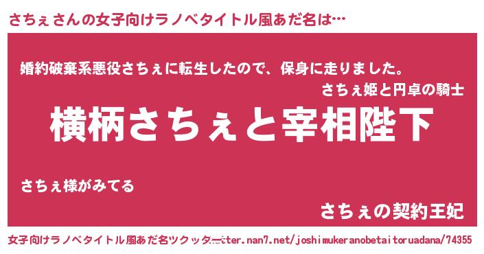 | 男性向けラノベタイトル風あだ名 | 『さちぇに滅ぼされるだけの簡単なお仕事です』 |