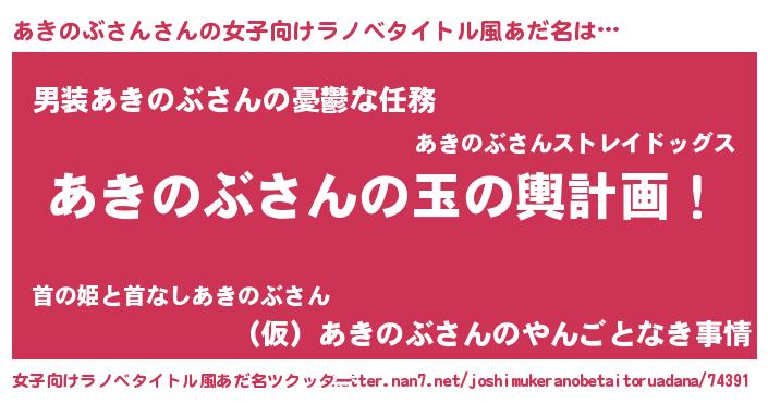 | 男性向けラノベタイトル風あだ名 | 『あきのぶさん~年齢イコール彼女いない歴の魔法使い~』 |
