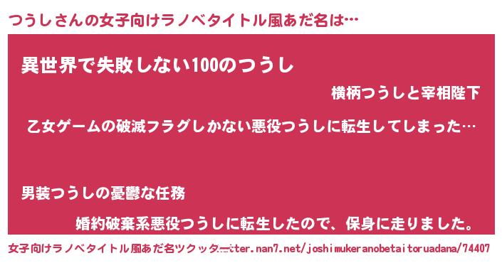 | 男性向けラノベタイトル風あだ名 | 『魔弾の王とつうし』『ツウシスレイヤー』 |