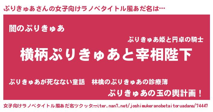 ぷりきゅあさんの女子向けラノベタイトル風あだ名は… 『横柄ぷりきゅあと宰相陛下』『闇のぷりきゅあ』『ぷりきゅあの玉の輿計画!』 ツクッター #女子向けラノベタイトル風あだ名ツクッター http://tkutter.nan7.net/joshimukeranobetaitoruadana/74447/
