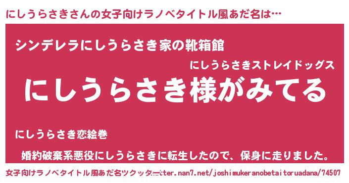 | 男性向けラノベタイトル風あだ名 | 『にしうらさきの嫁は女の子じゃないと思った?』 |