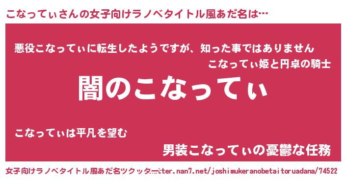 こなってぃさんの女子向けラノベタイトル風あだ名は… 『闇のこなってぃ』『悪役こなってぃに転生したようですが、知った事ではありません』『男装こなってぃの憂鬱な任務』 ツクッター #女子向けラノベタイトル風あだ名ツクッター http://tkutter.nan7.net/joshimukeranobetaitoruadana/74522/