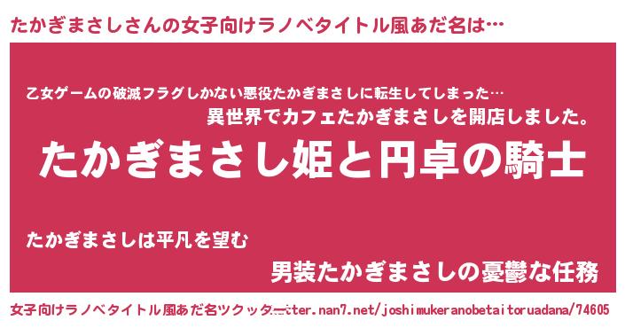 | 男性向けラノベタイトル風あだ名 | 『たかぎまさしの憂鬱』 |