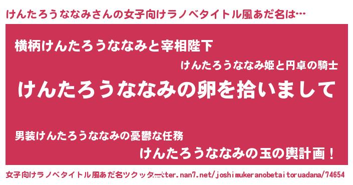 けんたろうななみさんの女子向けラノベタイトル風あだ名は… 『けんたろうななみの卵を拾いまして』『横柄けんたろうななみと宰相陛下』『けんたろうななみの玉の輿計画!』 ツクッター #女子向けラノベタイトル風あだ名ツクッター http://tkutter.nan7.net/joshimukeranobetaitoruadana/74654/