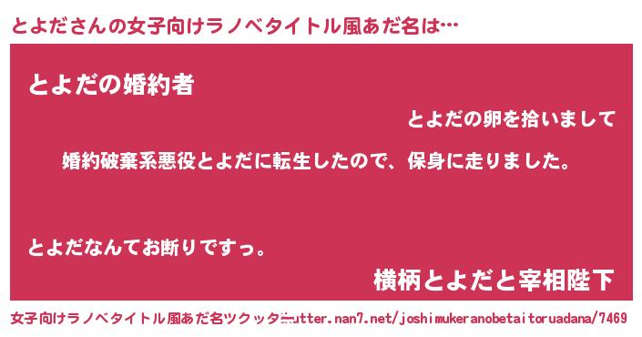 | 男性向けラノベタイトル風あだ名 | 『トヨダスレイヤー』 |