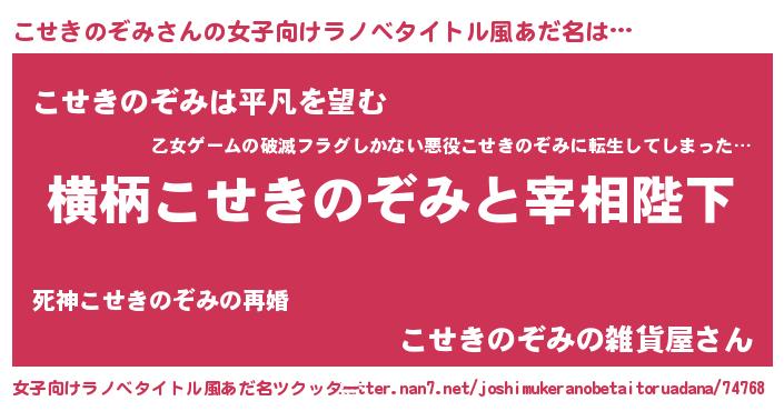 | 男性向けラノベタイトル風あだ名 | 『こせきのぞみに滅ぼされるだけの簡単なお仕事です』 |