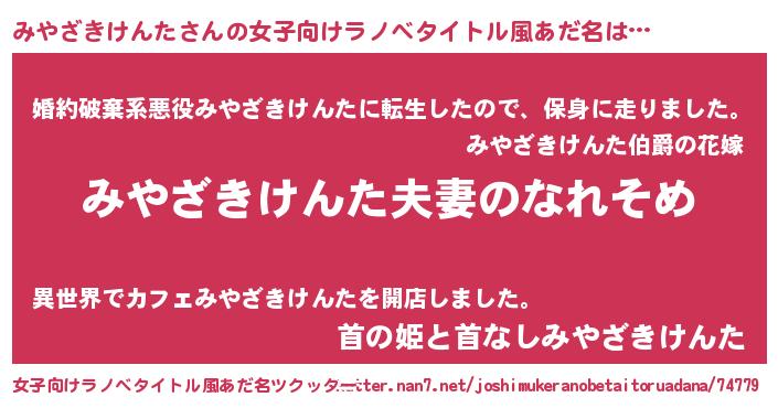 | 男性向けラノベタイトル風あだ名 | 『おまえをオタクにしてやるから、俺をみやざきけんたにしてくれ! 』 |