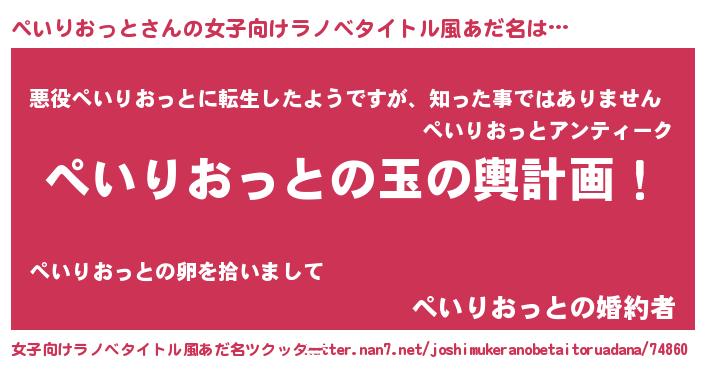 | 男性向けラノベタイトル風あだ名 | 『ぺいりおっと~年齢イコール彼女いない歴の魔法使い~』 |