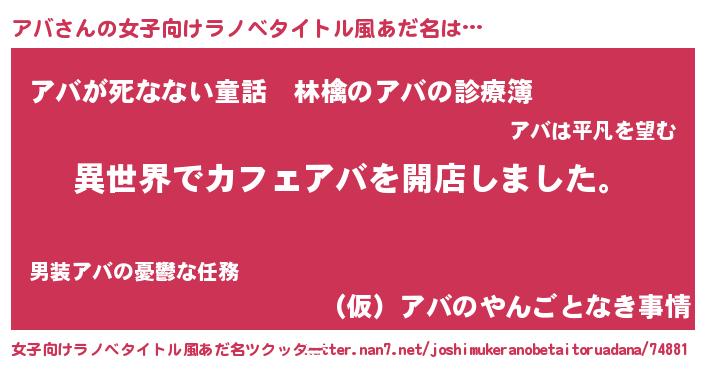 アバさんの女子向けラノベタイトル風あだ名は… 『異世界でカフェアバを開店しました。』『アバが死なない童話 林檎のアバの診療簿』『(仮)アバのやんごとなき事情』 ツクッター #女子向けラノベタイトル風あだ名ツクッター http://tkutter.nan7.net/joshimukeranobetaitoruadana/74881/