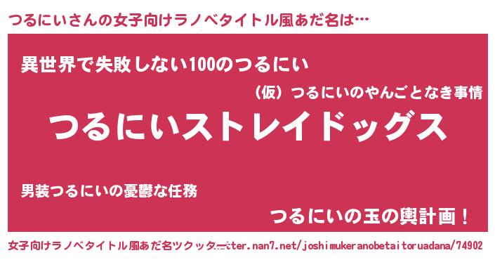 | 男性向けラノベタイトル風あだ名 | 『Re:つるにいから始める異世界生活』 |