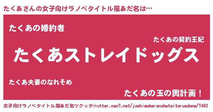 | 男性向けラノベタイトル風あだ名 | 『Re:たくあから始める異世界生活』 |