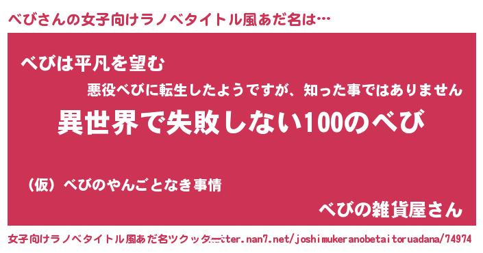 | 男性向けラノベタイトル風あだ名 | 『べびという概念が存在しない退屈な世界 』 |