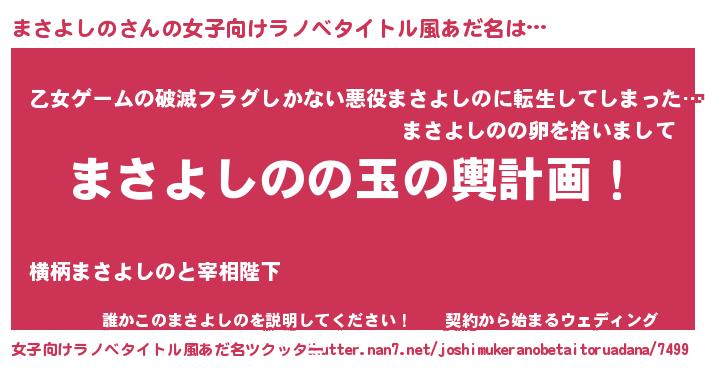 まさよしのさんの女子向けラノベタイトル風あだ名は… 『まさよしのの玉の輿計画!』『乙女ゲームの破滅フラグしかない悪役まさよしのに転生してしまった…』『誰かこのまさよしのを説明してください! ~契約から始まるウェディング~』 ツクッター #女子向けラノベタイトル風あだ名ツクッター http://tkutter.nan7.net/joshimukeranobetaitoruadana/7499/