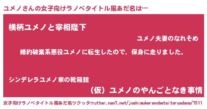 | 男性向けラノベタイトル風あだ名 | 『ユメノスレイヤー』『ユメノの憂鬱』 |
