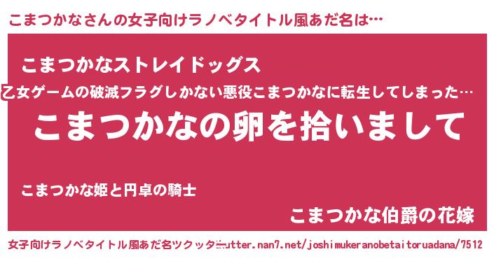 | 男性向けラノベタイトル風あだ名 | 『こまつかなの嫁は女の子じゃないと思った?』 |