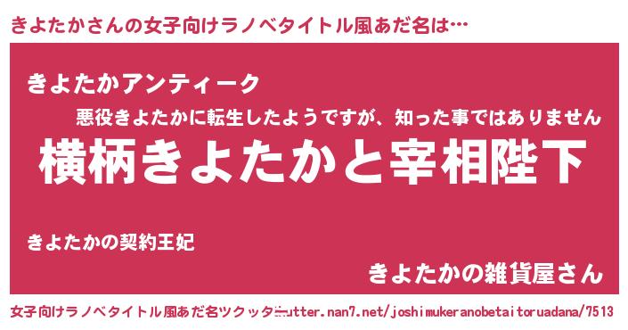 | 男性向けラノベタイトル風あだ名 | 『きよたかに滅ぼされるだけの簡単なお仕事です』 |